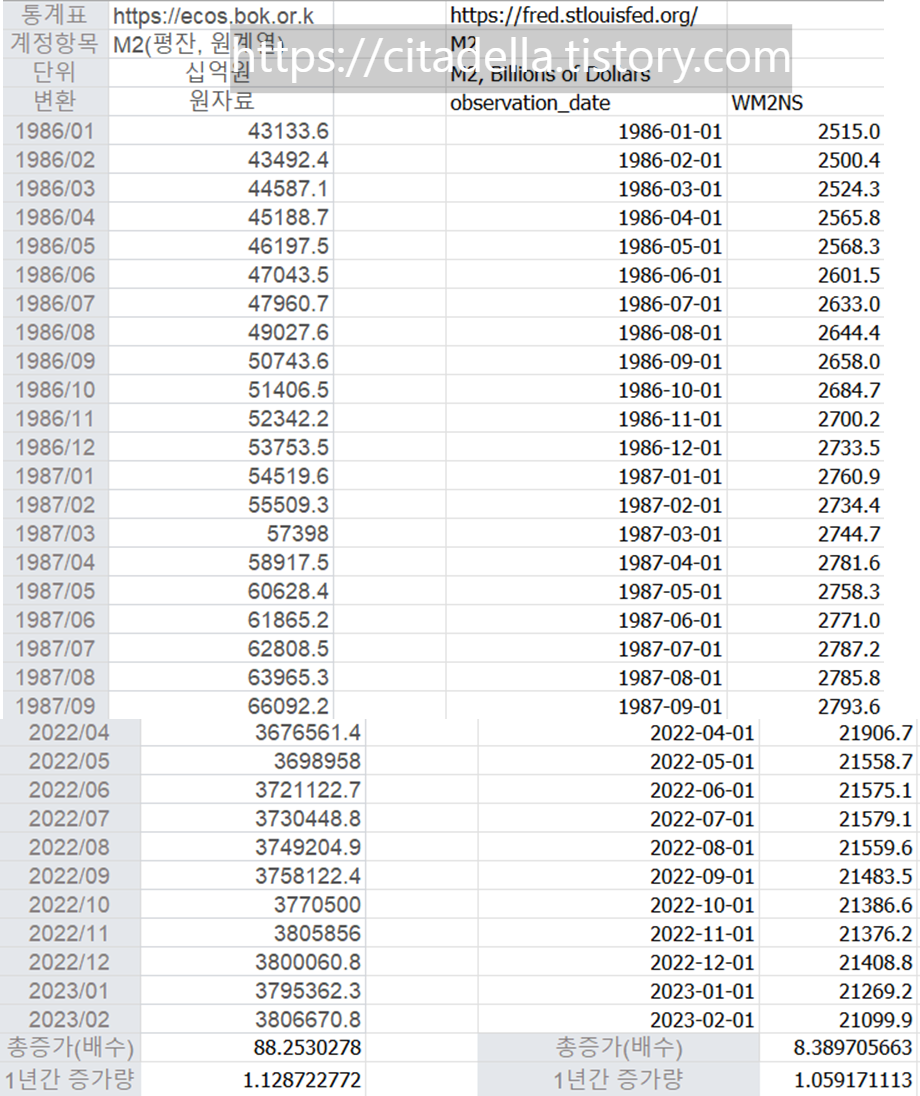 1986~2023까지 원화의 M2와 미국 달러의 M2의 증가율을 비교해보자.